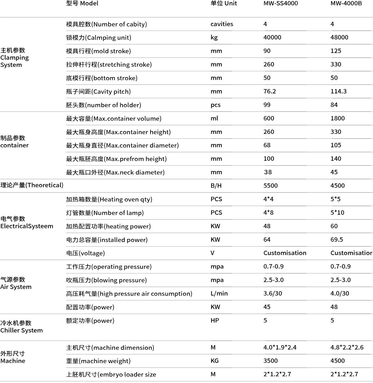 采用伺服電機(jī)驅(qū)動(dòng)環(huán)形鏈條; 采用伺服單通道上胚; 采用鋁合金制造的高壓吹氣組合閥,可有氣體回收裝置,減少能源消耗,保護(hù)環(huán)境; 采用PID恒定控制烤箱瓶胚加熱和風(fēng)機(jī)排風(fēng)。